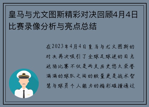 在2023年4月4日,皇马与尤文图斯的对决再次吸引了全球足球迷的目光。这场比赛不仅是两支历史悠久、荣誉满满的球队之间的较量,更是战术智慧与球员个人能力的精彩碰撞。通过对比赛录像的分析,我们可以深入探讨此次对决中的关键时刻、战术布置以及球员表现等多个方面。在接下来的文章中,我们将从比赛概况、战术分析、...